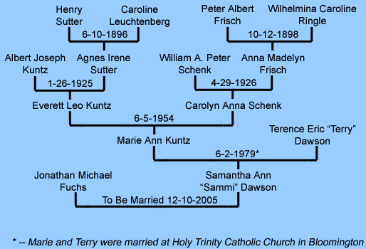 It turns out that three generations back along Sammi's family lines have been married at St. Mary's. Perhaps the best way to explain the links is in a Family Tree-style chart, as seen below. The five marriages leading up to Marie Ann Kuntz all occcurred at St. Mary's.